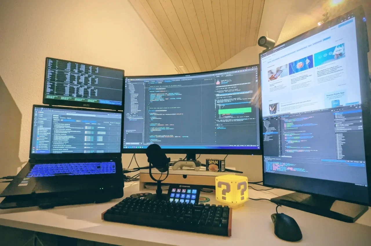 Der Laptop Stand ist „No Name“, er kühlt das Gerät zusätzlich. In der Mitte habe ich einen grossen Curved Screen, auf dem die Entwicklungsumgebung und ein oder mehrere Claude Code Terminals laufen. Der Hochkant Screen ist zum Testing/Debugging im Browser, während auf dem Laptop ein Browserfenster mit meinen Tasks, E-Mail, Firmenchat etc. läuft. Der Kleine „aufgesteckte“ Screen zeigt meistens das wichtigste Monitoring unserer Web-Systeme. Manchmal auch Trading Charts.
